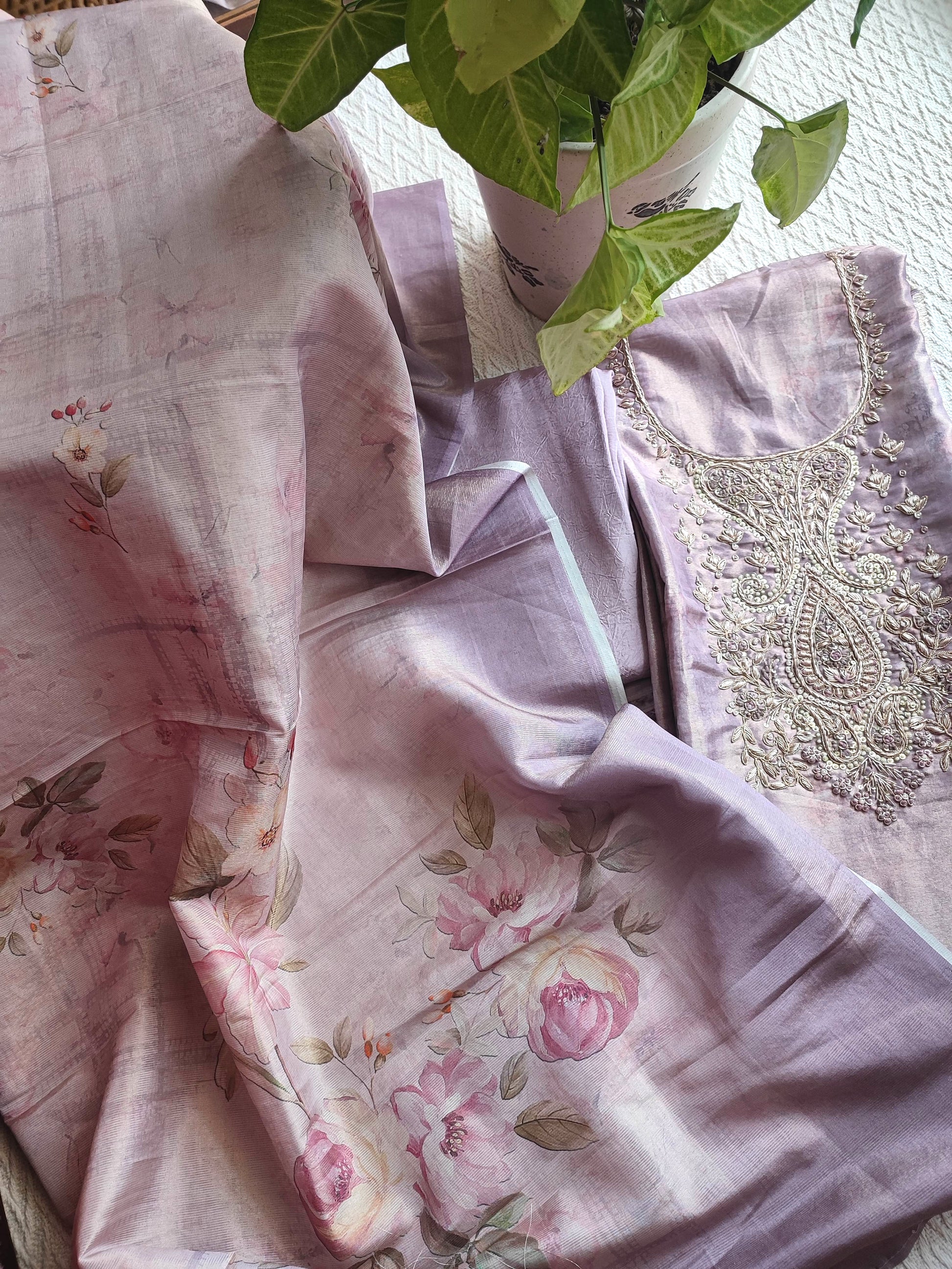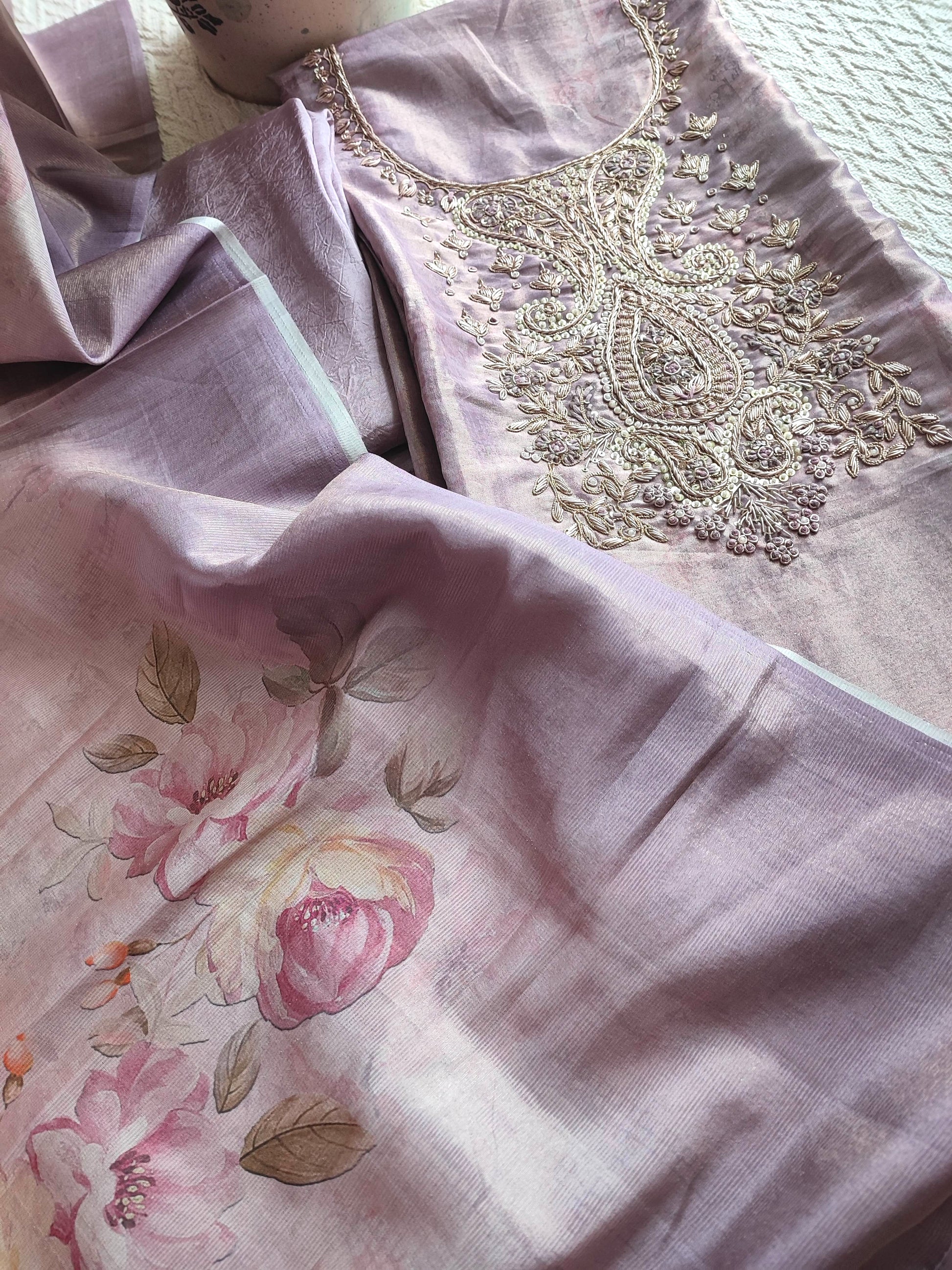 Shimmer Georgette Suit with Golden Zari Dupatta & Embroidered Neckline